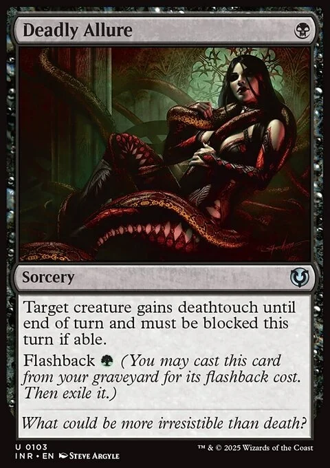 Target creature gains deathtouch until end of turn and must be blocked this turn if able. Flashback {G} (You may cast this card from your graveyard for its flashback cost. Then exile it.)