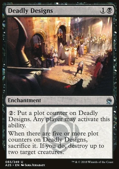 {2}: Put a plot counter on Deadly Designs. Any player may activate this ability. When there are five or more plot counters on Deadly Designs, sacrifice it. If you do, destroy up to two target creatures.