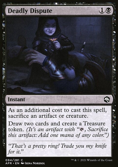 As an additional cost to cast this spell, sacrifice an artifact or creature. Draw two cards and create a Treasure token. (It's an artifact with "{T}, Sacrifice this token: Add one mana of any color.")