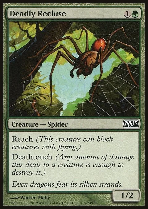 Reach (This creature can block creatures with flying.) Deathtouch (Any amount of damage this deals to a creature is enough to destroy it.)