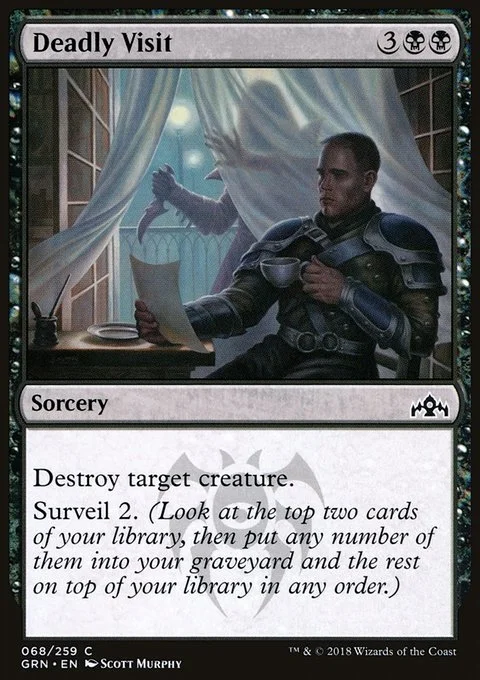 Destroy target creature. Surveil 2. (Look at the top two cards of your library, then put any number of them into your graveyard and the rest on top of your library in any order.)