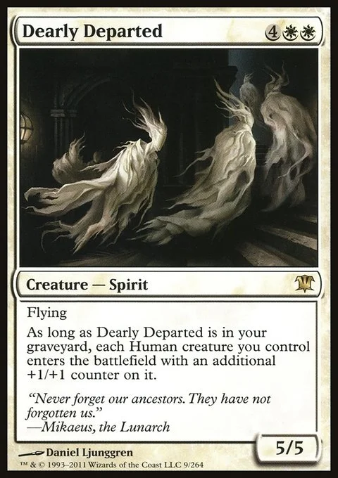 Flying As long as Dearly Departed is in your graveyard, each Human creature you control enters the battlefield with an additional +1/+1 counter on it.