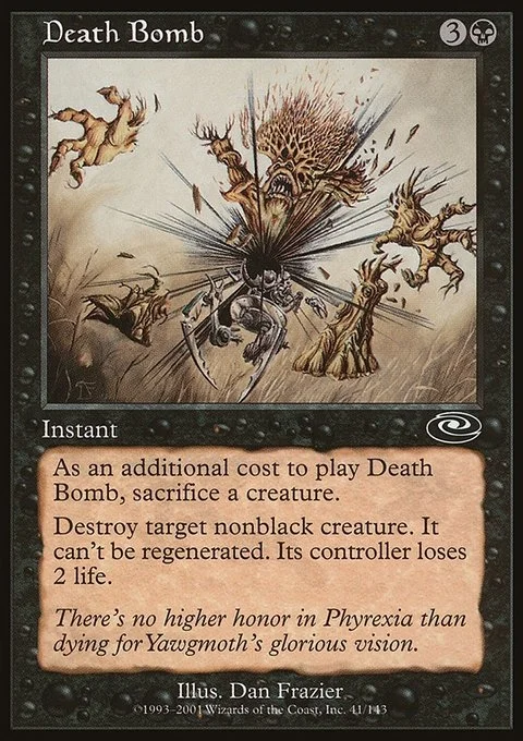 As an additional cost to cast this spell, sacrifice a creature. Destroy target nonblack creature. It can't be regenerated. Its controller loses 2 life.