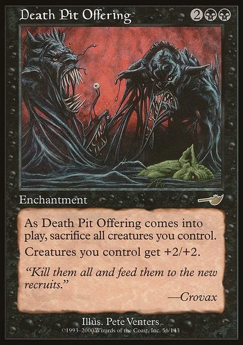 When Death Pit Offering enters the battlefield, sacrifice all creatures you control. Creatures you control get +2/+2.