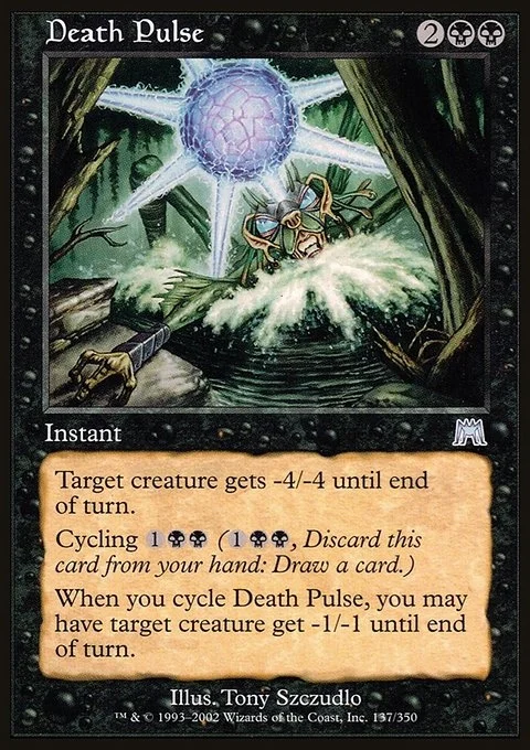 Target creature gets -4/-4 until end of turn. Cycling {1}{B}{B} ({1}{B}{B}, Discard this card: Draw a card.) When you cycle Death Pulse, you may have target creature get -1/-1 until end of turn.