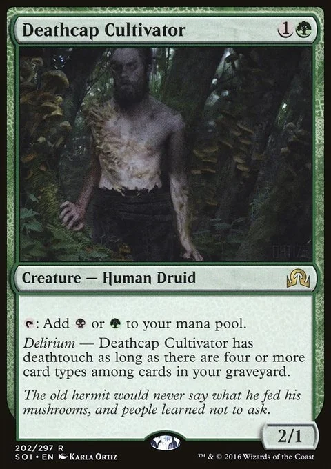 {T}: Add {B} or {G}. Delirium — Deathcap Cultivator has deathtouch as long as there are four or more card types among cards in your graveyard.