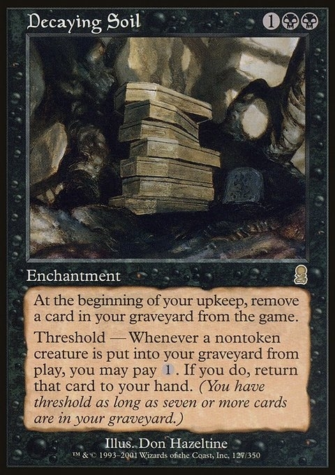 Threshold — As long as seven or more cards are in your graveyard, Decaying Soil has "Whenever a nontoken creature is put into your graveyard from the battlefield, you may pay {1}. If you do, return that card to your hand."