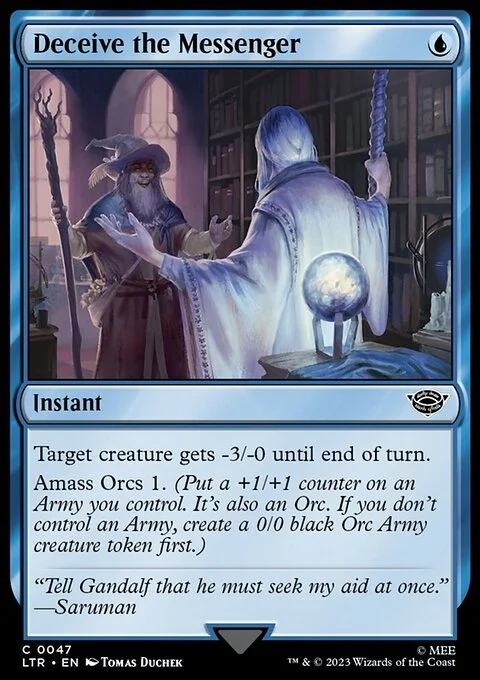Target creature gets -3/-0 until end of turn. Amass Orcs 1. (Put a +1/+1 counter on an Army you control. It's also an Orc. If you don't control an Army, create a 0/0 black Orc Army creature token first.)