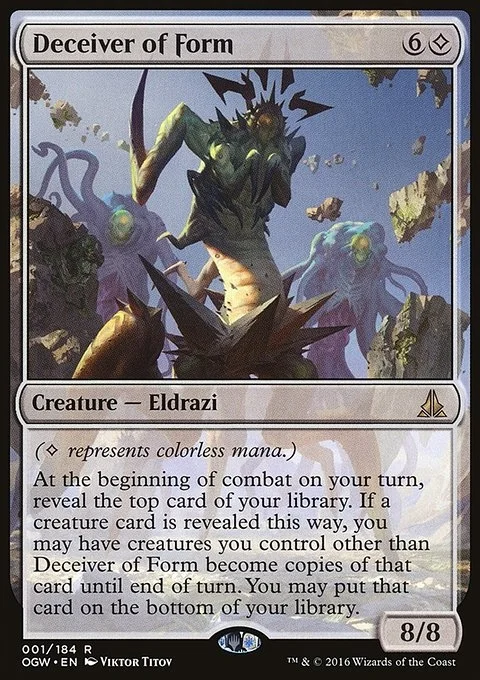 At the beginning of combat on your turn, reveal the top card of your library. If a creature card is revealed this way, you may have creatures you control other than Deceiver of Form become copies of that card until end of turn. You may put that card on the bottom of your library.