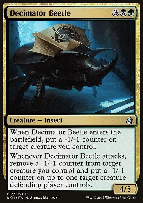 When Decimator Beetle enters the battlefield, put a -1/-1 counter on target creature you control.