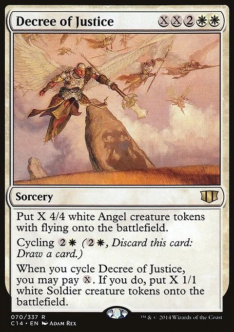 Create X 4/4 white Angel creature tokens with flying. Cycling {2}{W} ({2}{W}, Discard this card: Draw a card.) When you cycle Decree of Justice, you may pay {X}. If you do, create X 1/1 white Soldier creature tokens.