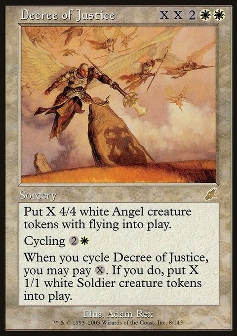 When you cycle Decree of Justice, you may pay X. If you do, put X 1/1 white Soldier creature tokens into play.
