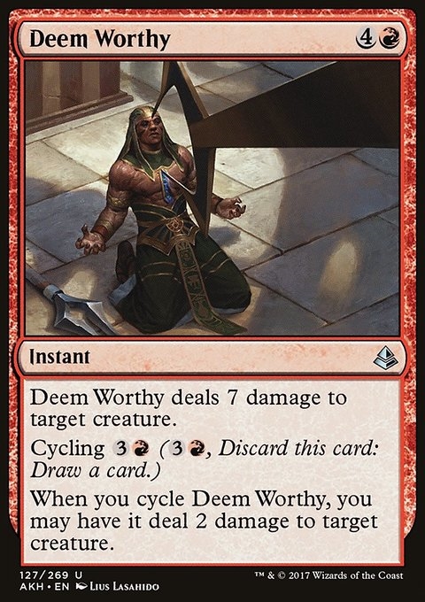 Deem Worthy deals 7 damage to target creature. Cycling {3}{R} ({3}{R}, Discard this card: Draw a card.) When you cycle Deem Worthy, you may have it deal 2 damage to target creature.