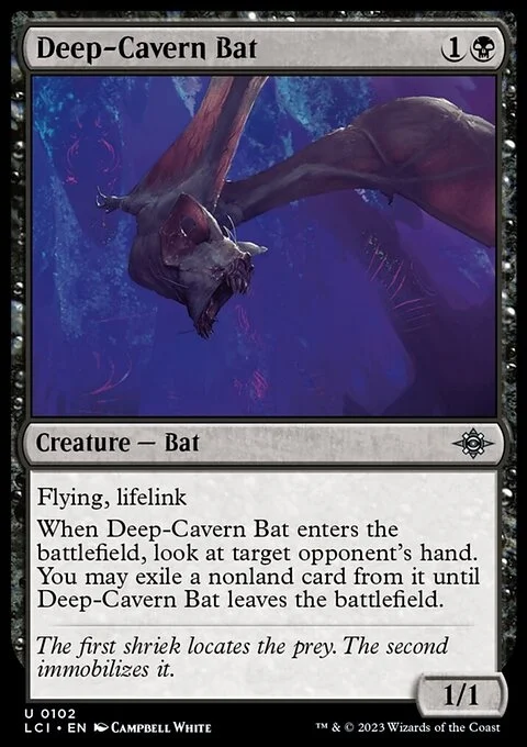 Flying, lifelink When Deep-Cavern Bat enters the battlefield, look at target opponent's hand. You may exile a nonland card from it until Deep-Cavern Bat leaves the battlefield.