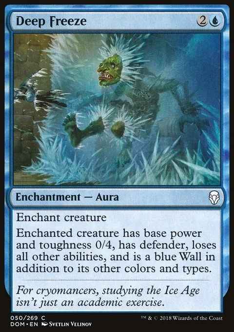 Enchant creature Enchanted creature has base power and toughness 0/4, has defender, loses all other abilities, and is a blue Wall in addition to its other colors and types.