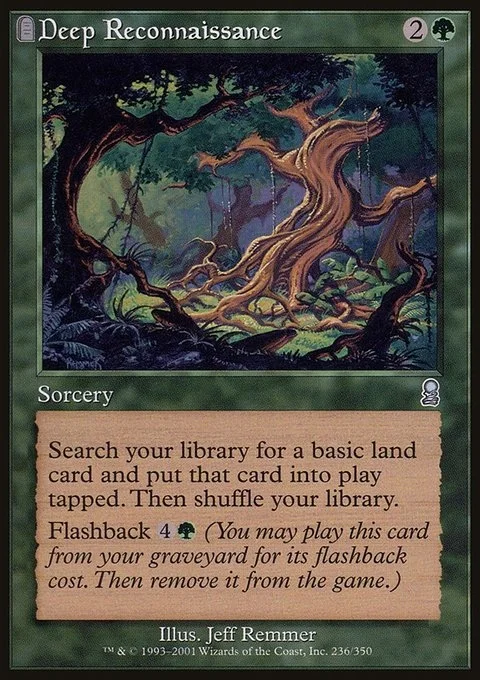 Search your library for a basic land card, put that card onto the battlefield tapped, then shuffle. Flashback {4}{G} (You may cast this card from your graveyard for its flashback cost. Then exile it.)