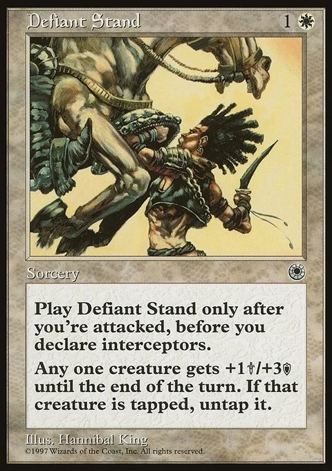 Play Defiant Stand only after you’re attacked, before you declare interceptors.Any one creature gets +1/+1 until the end of the turn. If that creature is tapped, untap it.
