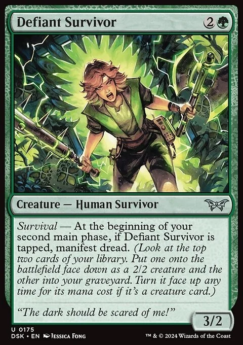 Survival — At the beginning of your second main phase, if Defiant Survivor is tapped, manifest dread. (Look at the top two cards of your library. Put one onto the battlefield face down as a 2/2 creature and the other into your graveyard. Turn it face up any time for its mana cost if it's a creature card.)
