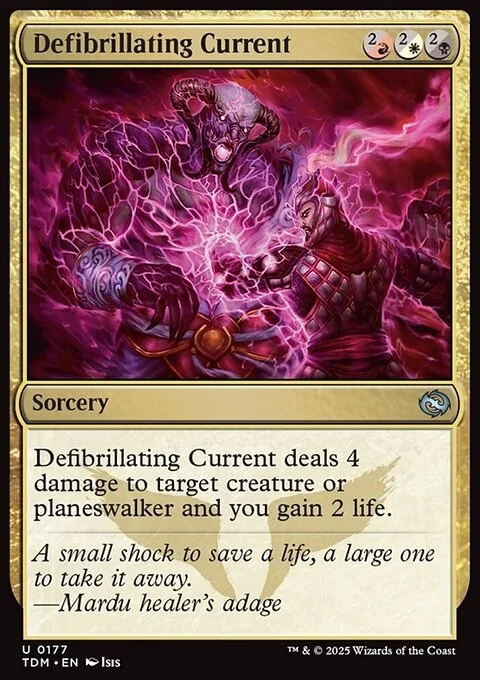 Defibrillating Current deals 4 damage to target creature or planeswalker and you gain 2 life.
