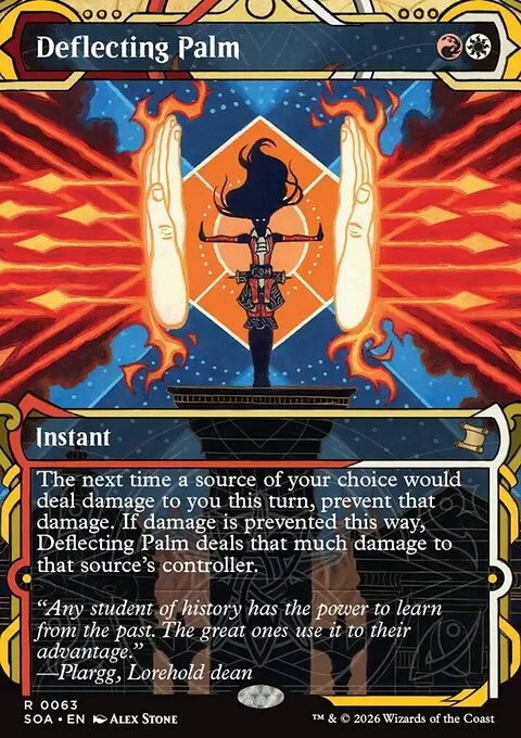 The next time a source of your choice would deal damage to you this turn, prevent that damage. If damage is prevented this way, Deflecting Palm deals that much damage to that source's controller.