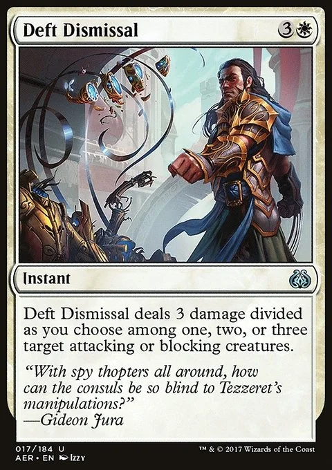 Deft Dismissal deals 3 damage divided as you choose among one, two, or three target attacking or blocking creatures.