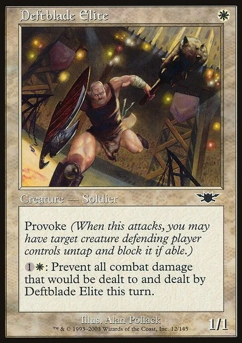 Provoke (Whenever this creature attacks, you may have target creature defending player controls untap and block it if able.) {1}{W}: Prevent all combat damage that would be dealt to and dealt by Deftblade Elite this turn.