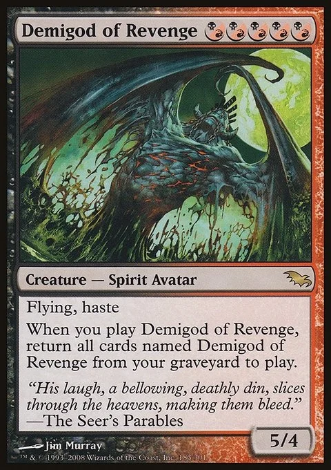 When you play Demigod of Revenge, return all cards named Demigod of Revenge from your graveyard to play.