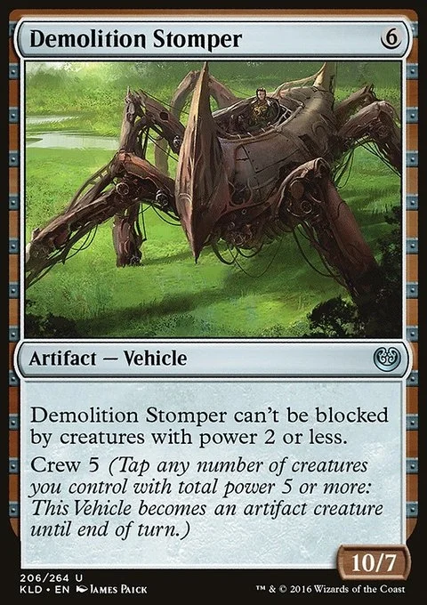 Demolition Stomper can't be blocked by creatures with power 2 or less. Crew 5 (Tap any number of creatures you control with total power 5 or more: This Vehicle becomes an artifact creature until end of turn.)