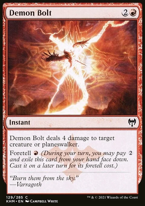 Demon Bolt deals 4 damage to target creature or planeswalker. Foretell {R} (During your turn, you may pay {2} and exile this card from your hand face down. Cast it on a later turn for its foretell cost.)