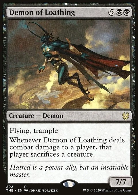 Flying, trample Whenever Demon of Loathing deals combat damage to a player, that player sacrifices a creature.