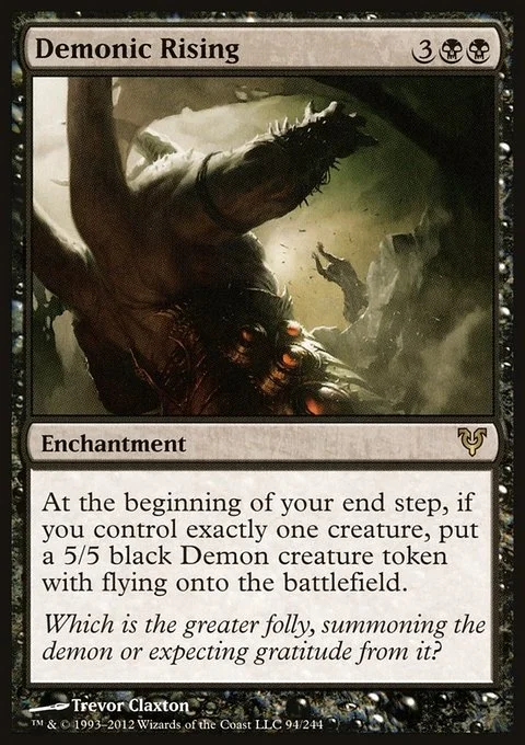 At the beginning of your end step, if you control exactly one creature, create a 5/5 black Demon creature token with flying.