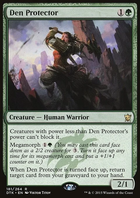 Creatures with power less than Den Protector's power can't block it. Megamorph {1}{G} (You may cast this card face down as a 2/2 creature for {3}. Turn it face up any time for its megamorph cost and put a +1/+1 counter on it.) When Den Protector is turned face up, return target card from your graveyard to your hand.