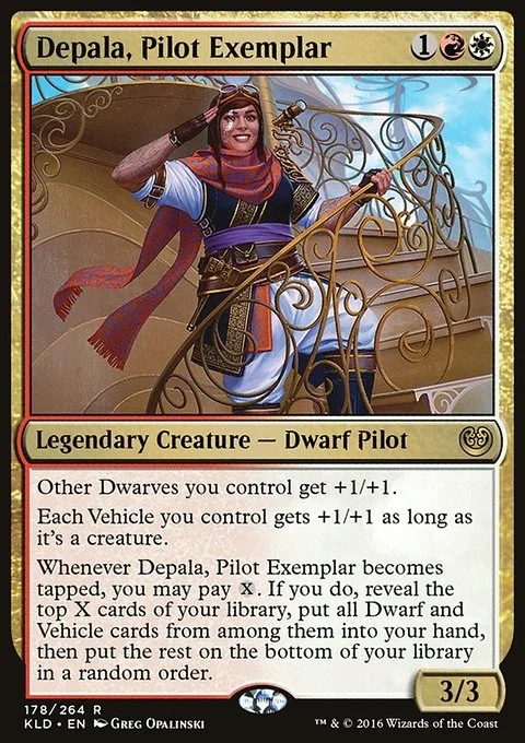 Whenever Depala, Pilot Exemplar becomes tapped, you may pay {X}. If you do, reveal the top X cards of your library, put all Dwarf and Vehicle cards from among them into your hand, then put the rest on the bottom of your library in a random order.