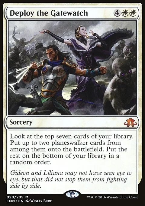 Look at the top seven cards of your library. Put up to two planeswalker cards from among them onto the battlefield. Put the rest on the bottom of your library in a random order.