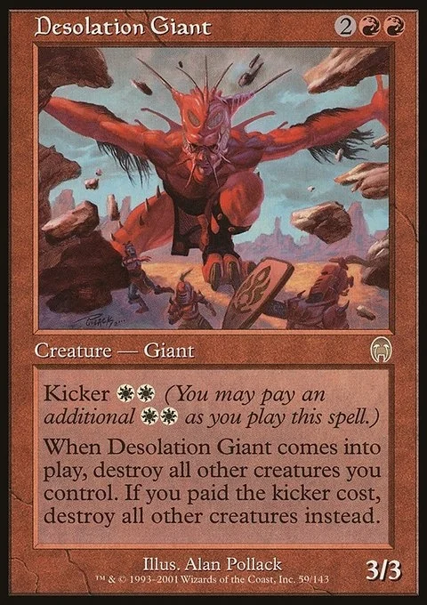Kicker {W}{W} (You may pay an additional {W}{W} as you cast this spell.) When Desolation Giant enters the battlefield, destroy all other creatures you control. If it was kicked, destroy all other creatures instead.