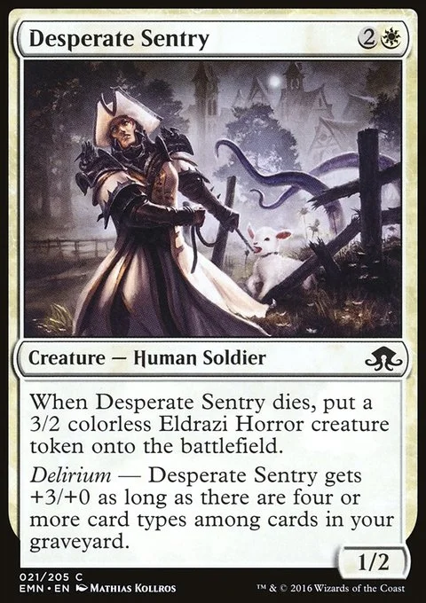 When this creature dies, create a 3/2 colorless Eldrazi Horror creature token. Delirium — This creature gets +3/+0 as long as there are four or more card types among cards in your graveyard.
