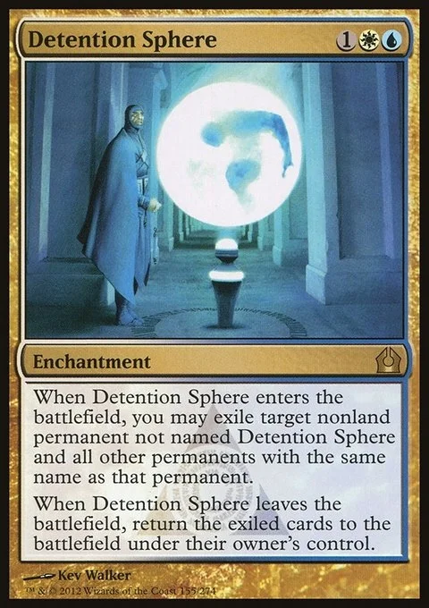 When Detention Sphere enters the battlefield, you may exile target nonland permanent not named Detention Sphere and all other permanents with the same name as that permanent. When Detention Sphere leaves the battlefield, return the exiled cards to the battlefield under their owner's control.