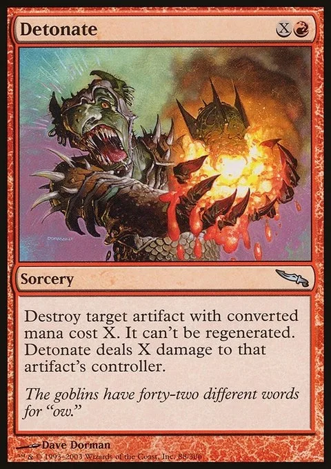 Destroy target artifact with mana value X. It can't be regenerated. Detonate deals X damage to that artifact's controller.