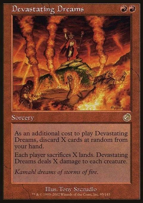 As an additional cost to cast this spell, discard X cards at random. Each player sacrifices X lands. Devastating Dreams deals X damage to each creature.