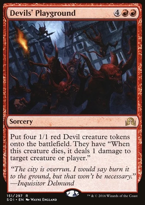 Create four 1/1 red Devil creature tokens. They have "When this creature dies, it deals 1 damage to any target."