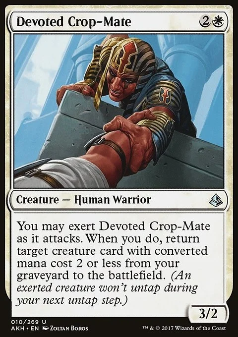 You may exert Devoted Crop-Mate as it attacks. When you do, return target creature card with mana value 2 or less from your graveyard to the battlefield. (An exerted creature won't untap during your next untap step.)