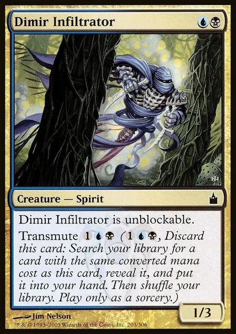 Dimir Infiltrator can't be blocked. Transmute {1}{U}{B} ({1}{U}{B}, Discard this card: Search your library for a card with the same mana value as this card, reveal it, put it into your hand, then shuffle. Transmute only as a sorcery.)