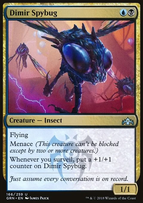 Flying Menace (This creature can't be blocked except by two or more creatures.) Whenever you surveil, put a +1/+1 counter on Dimir Spybug.