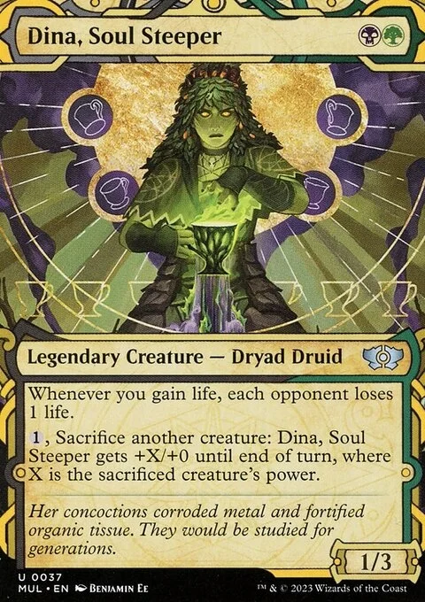 Whenever you gain life, each opponent loses 1 life. {1}, Sacrifice another creature: Dina, Soul Steeper gets +X/+0 until end of turn, where X is the sacrificed creature's power.
