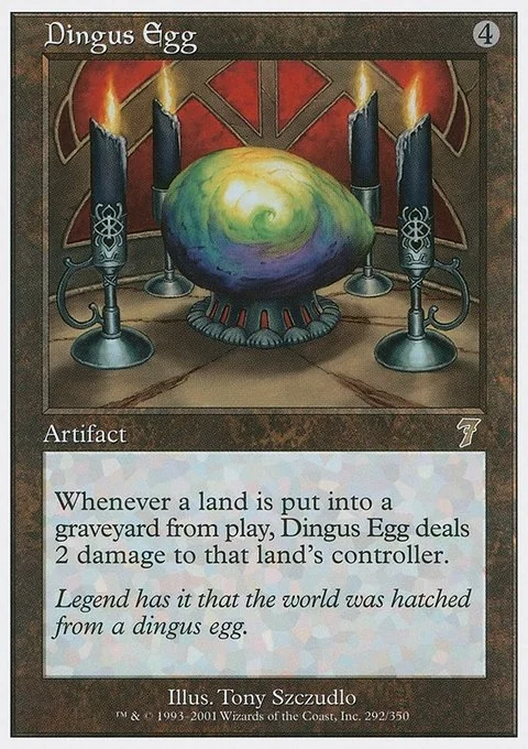 Whenever a land is put into a graveyard from the battlefield, Dingus Egg deals 2 damage to that land's controller.