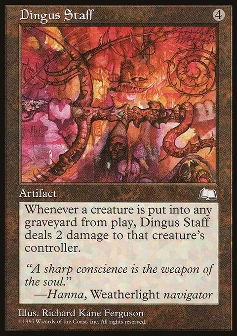 Whenever a creature is put into any graveyard from play, Dingus Staff deals 2 damage to that creature’s controller.