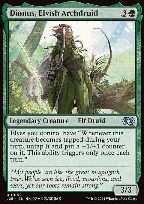 Elves you control have "Whenever this creature becomes tapped during your turn, untap it and put a +1/+1 counter on it. This ability triggers only once each turn."