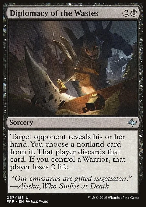 Target opponent reveals their hand. You choose a nonland card from it. That player discards that card. If you control a Warrior, that player loses 2 life.