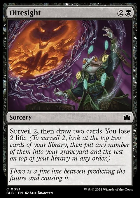 Surveil 2, then draw two cards. You lose 2 life. (To surveil 2, look at the top two cards of your library, then put any number of them into your graveyard and the rest on top of your library in any order.)