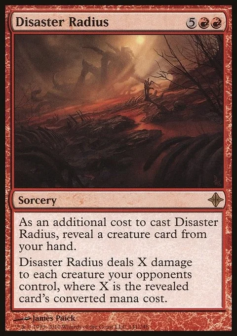 As an additional cost to cast this spell, reveal a creature card from your hand. Disaster Radius deals X damage to each creature your opponents control, where X is the revealed card's converted mana cost.